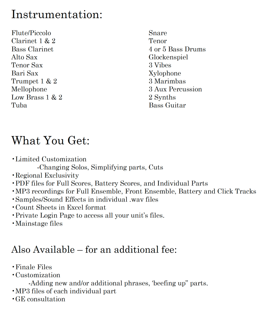 This show comes complete with: 1) Full Winds, Battery, Front Ensemble books, and 2) Mainstage files and samples.